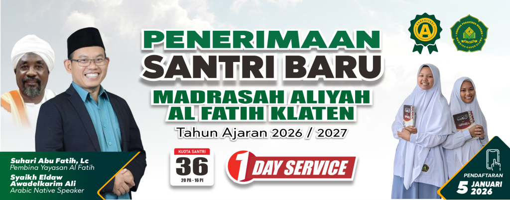 Ponpes Modern Al Fatih Klaten. Mencetak kader Ulama, Insan Beriman bertaqwa Cerdas dan memiliki daya guna, bermanfaat di masyarakat, Agama dan Negara.